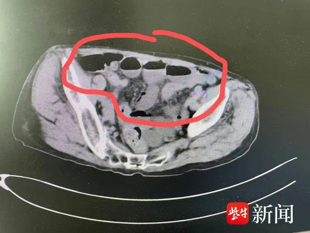 而检查结果也证实了这一点,CT提示老人的盆腔漏了一个“洞”,一段肠子从这个“洞”掉进了大腿根部。