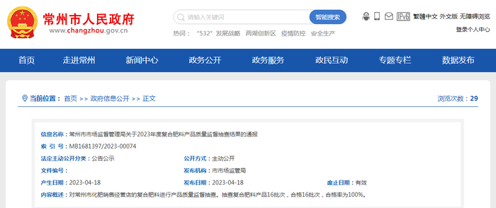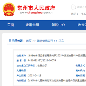 中国质量新闻网讯 据江苏省常州市人民政府网站4月18日消息,2023年1月起,常州市市场监督管理局委托常州检验检测标准认证研究院,对常州市化肥销售经营店的复合肥料进行产品质量监督抽查。抽查复合肥料产品16批次,合格16批次,合格率为100%。