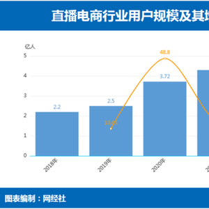 网经社电子商务研究中心发布的《2022年度中国直播电商市场数据报告》显示,用户规模方面,2022年直播电商用户规模达4.73亿人,同比增长10%,增速下滑。 2018-2021年直播电商的用户规模分别为2.2亿人、2.5亿人、3.72亿人、4.3亿人,2020年用户规模增速达到顶峰,为48.8%,而后两年增速逐渐放缓。