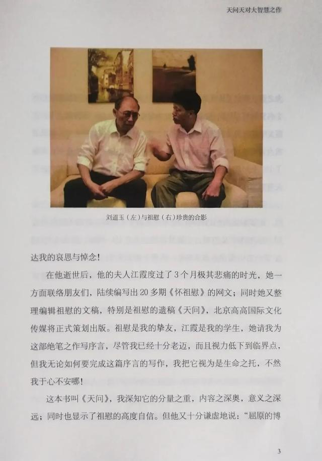 著名教育家、前武汉大学前校长刘道玉在为《天问》一书作序中写道:“祖慰是一位智慧高深的全才,他的学问跨越文学、艺术、建筑学、规划设计学等领域......我大致浏览了他部分书稿,的确是言他人之未言,问他人之未问,能够启迪人们思考更广泛与深奥的学术问题。”