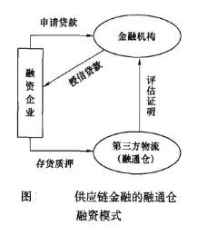 图是一个典型的融通仓融资模式。在这种模式中,抵押货物的贬值风险是金融机构重点关注的问题。因此,金融机构在收到中小企业融通仓业务申请时,应考察企业是否有稳定的库存、是否有长期合作的交易对象以及整体供应链的综合运作状况,以此作为授信决策的依据。
