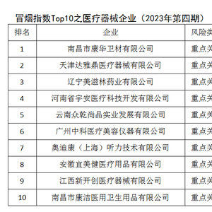 中国食品药品网讯 近日,中国健康传媒集团舆情监测中心发布冒烟指数Top10之医疗器械企业(2023年第四期),公开风险指数排名前十的企业。南昌市康华卫材有限公司、天津达雅鼎医疗器械有限公司、辽宁美滋林药业有限公司、河南省宇安医疗科技开发有限公司、云南众乾尚品实业发展有限公司、广州中科医疗美容仪器有限公司、奥迪康(上海)听力技术有限公司、安徽宜美健医疗用品有限公司、江西新开创医疗器械有限公司、南昌市康洁医用卫生用品有限公司位列前十名,均为“重点关注”企业。
