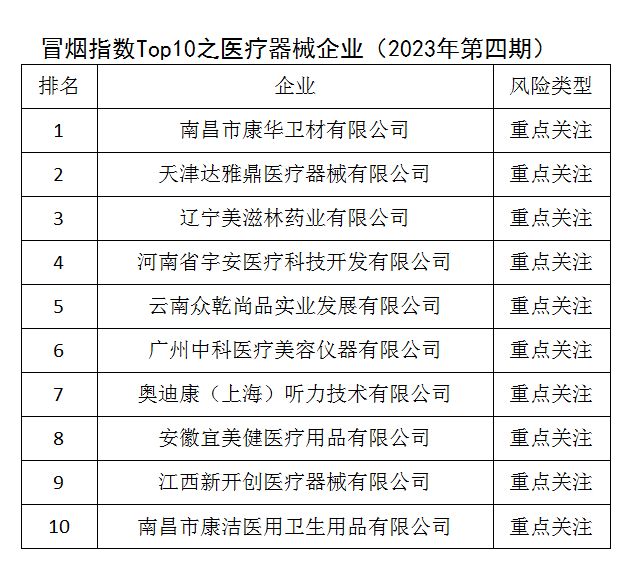 冒烟指数Top10之医疗器械企业(2023年第四期)发布