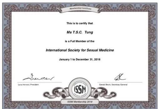 曾赴美国、德国进修,并以优异成绩获得美国ACS临床杏学家学院证书、德国谭崔(Tantra)性能开发工作坊四阶(高阶)结业。