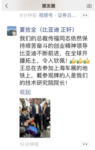 4月20日,比亚迪非执行董事夏佐全在个人微信朋友圈,发布了比亚迪董事长王传福在上海,乘坐地铁参加2023第二十届上海国际汽车工业展览会(下称“2023上海车展”)的照片。