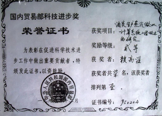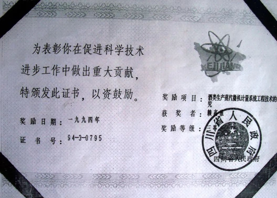 “我当时英文不好,还是随行的同事说,台上在喊我的名字,我才懵懵懂懂地上台去领了证书回来,后来还是找厂里英文专业的人翻译,才知道上面这样写道:‘在世界最大的酒类行业中,您被证明具有无可非议的品质和优秀才智。’”