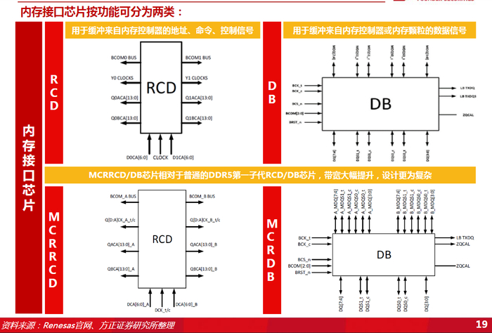 公开资料显示,内存接口芯片按功能分类,一是寄存缓冲器(RCD,又称“寄存时钟驱动器”),用来缓冲来自内存控制器的地址/命令/控制信号;二是数据缓冲器(DB),用来缓冲来自内存控制器或内存颗粒的数据信号。