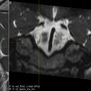 随后,这名女子来到上海交通大学医学院附属新华医院神经外科李世亭教授门诊,经外展神经薄分层核磁共振扫描这一影像学检查发现,她的右侧小脑前下动脉明显压迫右侧外展神经,导致外展神经出现 “短路” 。