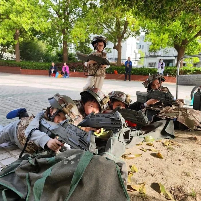 真人CS是一项集运动、游戏、军事为一体的户外运动,不仅可以让青少年获取安全教育知识,陶冶情操,磨练意志,还可以锻炼他们的身体,释放压力。少年们戴上迷彩帽,神气十足地拿着道具枪,分组军事对抗。孩子们在一攻一守的作战中,展示出他们身上蕴藏的勇气与智慧。