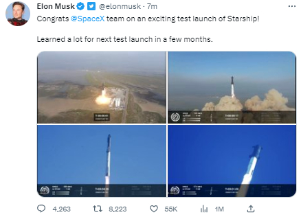 刚刚,SpaceX公司首席执行官马斯克在推特对此次爆炸作出回应,称通过此次任务为几个月后的下一次测试发射吸取了教训。“在一次令人兴奋的‘星舰’测试发射后,祝贺SpaceX团队!为几个月后的下一次测试发射学到了很多东西。”马斯克称。