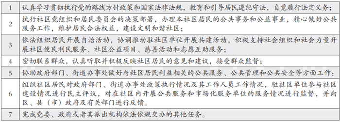 《中华人民共和国城市居民委员会组织法》将居民委员会定义为:城市社区居民实行自我管理、自我服务、自我教育、自我监督的基层群众性自治组织。社区居民委员会下设人民调解、治安保卫、公共卫生、环境和物业管理等委员会,协助街道办事处开展工作。