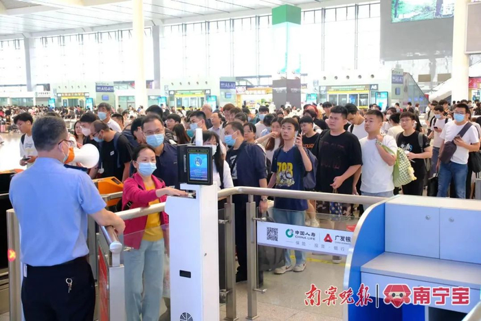4月20日上午,南宁东站候车大厅客流量明显增加,旅客有序检票进站乘车。