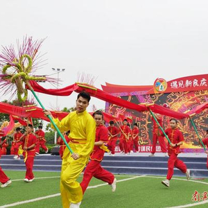 南宁市体强路小学以钱鞭舞《丰收乐》欢庆“三月三”。南宁市体强路小学师生以香火龙舞和传统舞龙相结合的龙舞《多彩华夏》展现气势恢宏的舞龙文化,让非物质文化遗产在校园绽放活力。