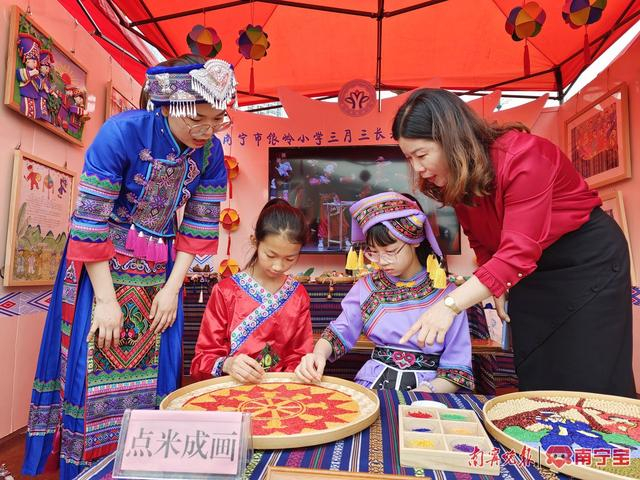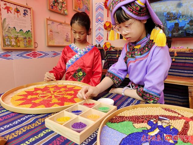 在南宁市银岭小学展台,学生正在展示非物质文化遗产项目——点米成画。学生以五谷种子为原料,将壮乡元素和学校办学理念“让学校充满美好”相结合进行创作,点化成一个个富有特色的作品,传承点米成画技艺。