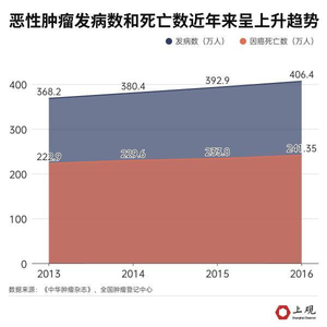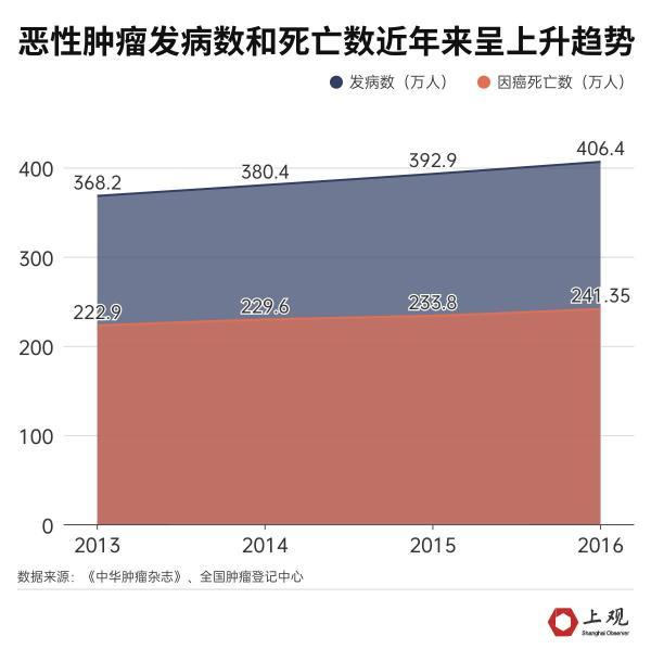 近年来,我国患癌人数和因为癌症去世的人数不断上升。最新数据显示,全国恶性肿瘤新发病例约406.40万,其中男性223.43万例,女性182.96万例,粗发病率为293.91/10万。