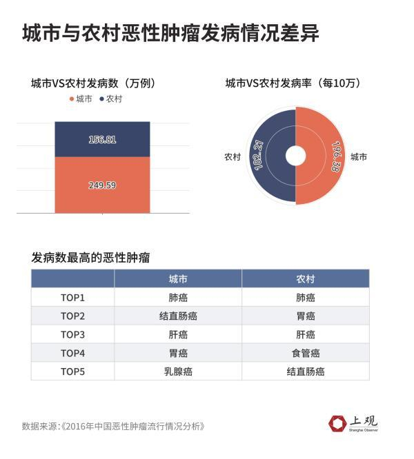 城市恶性肿瘤的发病数位249.59万例,占到总体发病数的61.41%。要知道,当年城镇常住人口占总人口的比重为57.35%。农村地区的发病数为156.81万例,占比为38.59%。