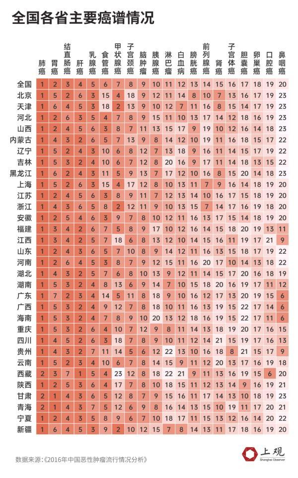 在全国各省,肺癌是除了西藏、甘肃、青海的其它所有地区发病数最高的癌症。位处西北的甘肃与青海发病数最高的为胃癌,西藏发病数最高的则是肝癌。