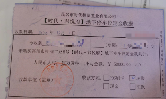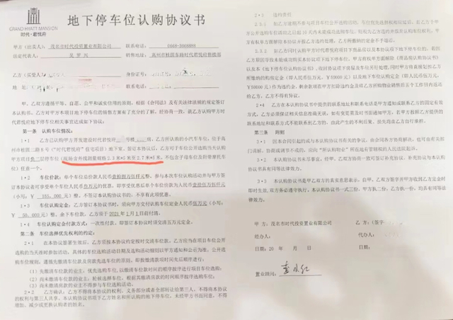 周女士介绍,2021年2月,她购买了茂名时代君悦府一套房产,并与开发商——茂名市时代投资置业有限公司签订了购房合同。 “他们说不买车位就不能买房子。签购房合同的前提是,必须付5万元的车位定金。”