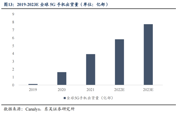 消费电子新驱动力:“5G+快充”。根据Canalys预测,2023年全球5G手机出货量将达到7.74亿部,约占整个智能手机市场份额的51.4%。中国作为全球5G网络建设的重点区域,将是全球最大的5G手机市场,出货量预计占全球市场的34%。5G手机在快充技术和快充协议方面不断发力,带来对电池监测芯片和安全保护芯片的增量需求,同时充电协议需要电源适配器内置识别不同设备协议的智能芯片,从而配置相应充电功率。