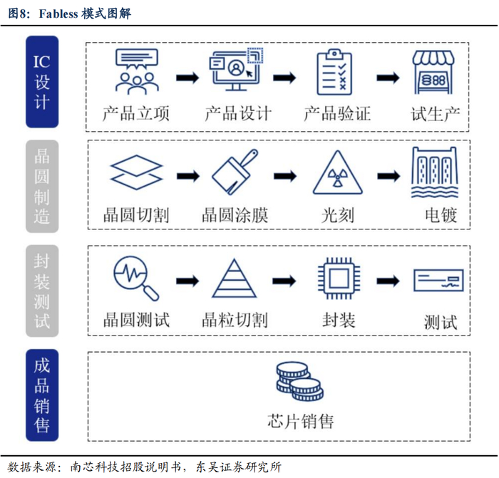 生产模式方面,半导体相关企业主要采用IDM、Fabless、Foundry三种模式。IDM主要指企业完全覆盖产业链(即打通“设计—生产—销售”链路),Fabless指企业只触及芯片设计与销售,Foundry则指从事芯片生产工作,即晶圆代工。海外龙头企业长期深耕模拟芯片产业,主要采用IDM生产模式,实现产业链纵向拓深;而中国本土企业发展时间较短,普遍采用Fabless模式,相对轻资产但对供应链环节中制造、封测环节产生强依赖性,当晶圆产能不足、分配困难时,相关模拟芯片厂商易遭受影响。