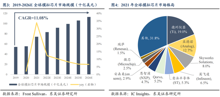 全球模拟芯片市场规模稳步增长,CR10约为68.2%。根据Frost Sullivan,2021年全球模拟芯片市场规模达741亿美元,预计2025年突破千亿规模、2026年市场规模突破1100亿美元,2019-2026年CAGR为11.08%,其中2021年受下游影响全球模拟芯片市场规模增速较快,同比增长33.90%,随后增速回归正常区间。根据IC Insights,2021年全球模拟芯片市场CR10约为68.2%,从龙头市占率的情况来看,模拟芯片市场并未出现明显的寡头垄断,总体而言市场较为分散。这或与模拟芯片市场品种多、分类细、下游应用场景泛化有关。