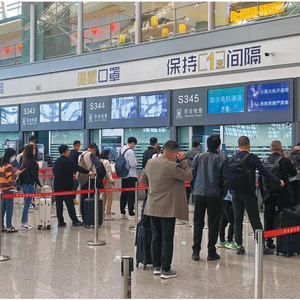 当日10时,闫慧在T3航站楼内进行产品推介,值机柜台和自助值机设备前、安检口都排着长队。