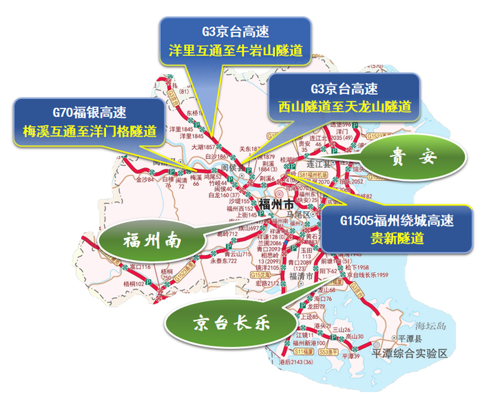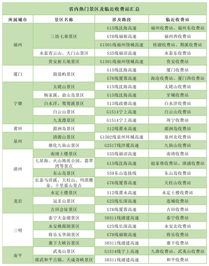 同时,旅游线路涉及的沈海高速海沧枢纽、泉南高速张坑枢纽、京台高速排头枢纽等路段也存在类似情况。建议尽量错时错峰出行,如遇车多缓行,可选择提前下高速绕行。