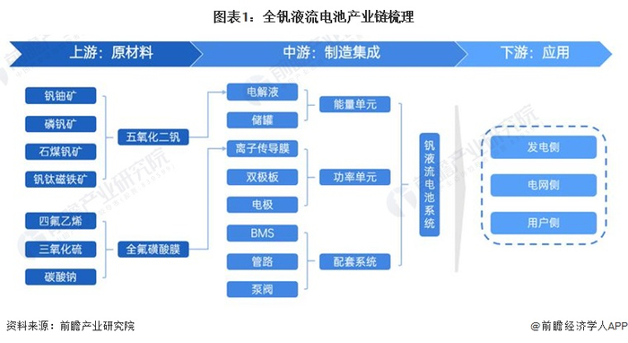 全钒液流电池产业链上游主要涉及钒资源的开采与冶炼,中游则进行全钒液流电池储能系统的设计与制造,包括功率单元(电堆)与能量单元(电解液)两大部分,下游主要为储能项目的开发和运营。由于下游储能市场可选择技术路径较多,且当前电化学储能主力仍为锂离子电池,全钒液流电池的增长目前对下游影响较小,产业变化主要集中在上游和中游。而中游环节中电解液是全钒液流电池中的核心材料,直接影响能量单元的性能与成本。
