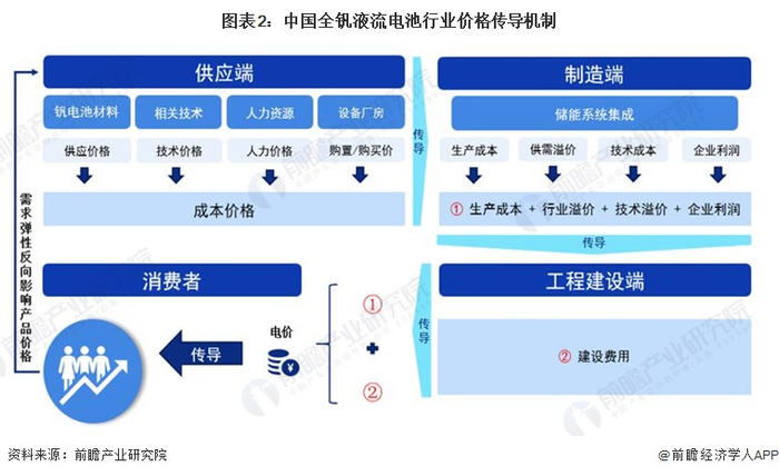 由于全钒液流电池主要应用与长时储能市场,该市场价格由行业供应端、制造端、工程建设端的增值溢价及消费需求弹性共同作用而成、并逐级传导。供应端的成本价格包括钒电池材料价格、技术价格、人力价格和设备厂房的购置/购买价等,传导至制造端成为生产成本,制造端综合供需溢价、研发成本和企业利润,形成“制造端价格”传导至工程建设端;工程建设端综合建设费用,形成了最终电价传导至消费者,而消费市场需求弹性也反作用于供应端、制造端,形成“价格-需求-价格”的传导路径来影响中国电化学储能市场的定价。