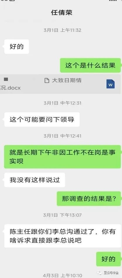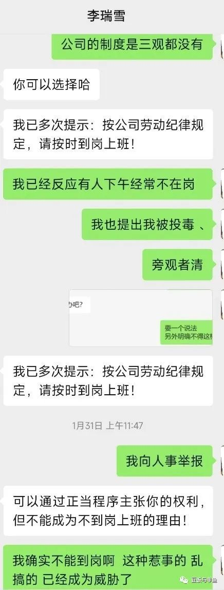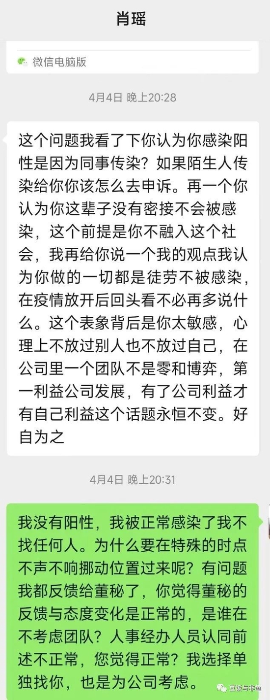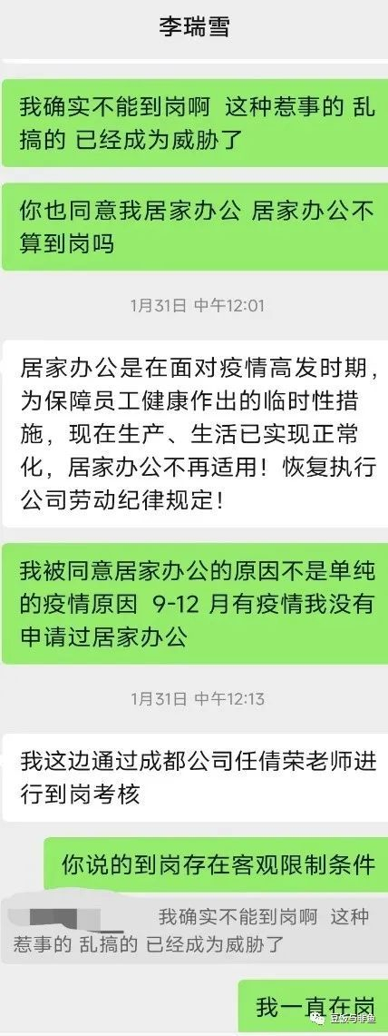 3、2023年1月31日,在董秘无理不解决我被阳性威胁反而一再要求我到公司办公的事情,经几轮无效沟通后,我向人事部长陈建国以及人事副总秦世哲说明我被影响的事情及举报王薇不在岗。人事部长陈建国表示收到,人事副总秦世哲表示会找我沟通,并于2023年2月2日联系我沟通,因人事副总秦世哲没有对王薇经常下午不在岗情况进行事实调查,所以没有实际沟通。