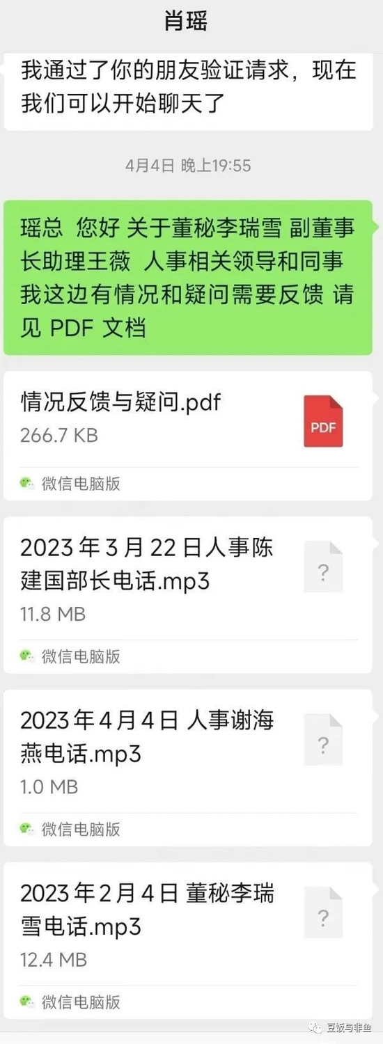 15、2023年4月13日(周四)下午,我联系提供了此事的情况及相关材料给董事长肖宁的助理齐开。他周五告知我已转达董事长。