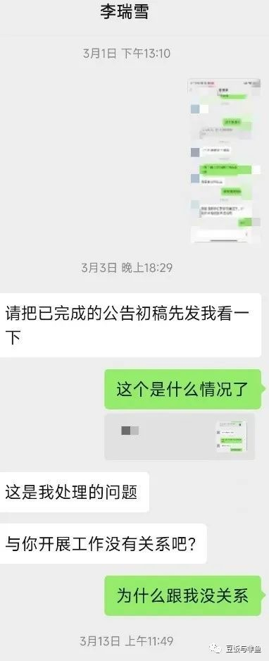 2023年3月3日,董秘李瑞雪联系我,我再次问了不在岗的调查情况,他告知此事跟我没关系(年报的临时公告我是准备梳理全部公告只剩下部分财务细节等财务再次反馈确认的程度,董秘李瑞雪为了不回复,自行另改写了部分去年的不规范公告,所以3月后的公司公告水平质量是下降的)。