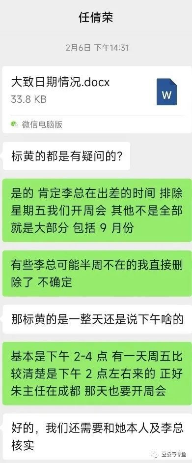 5、2023年2月6日下午,子公司人事任倩荣联系我,她将根据总经办田主任的要求进行调查核实,并让我协助提供了日期情况,我提供了大致日期情况。在此之后期间,监事会主席邵静至少两次告诉我王薇去格尔木要ESG报告的数据,去了很久了。那段时间董秘李瑞雪部分时间也在格尔木。