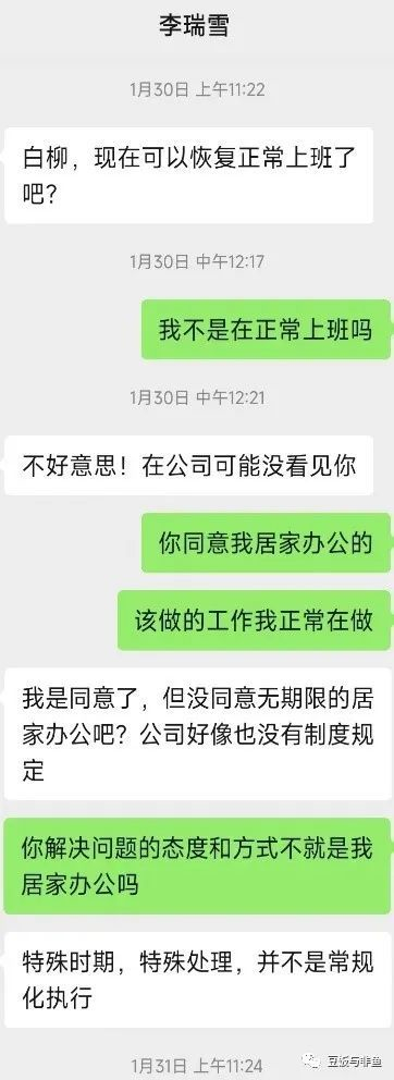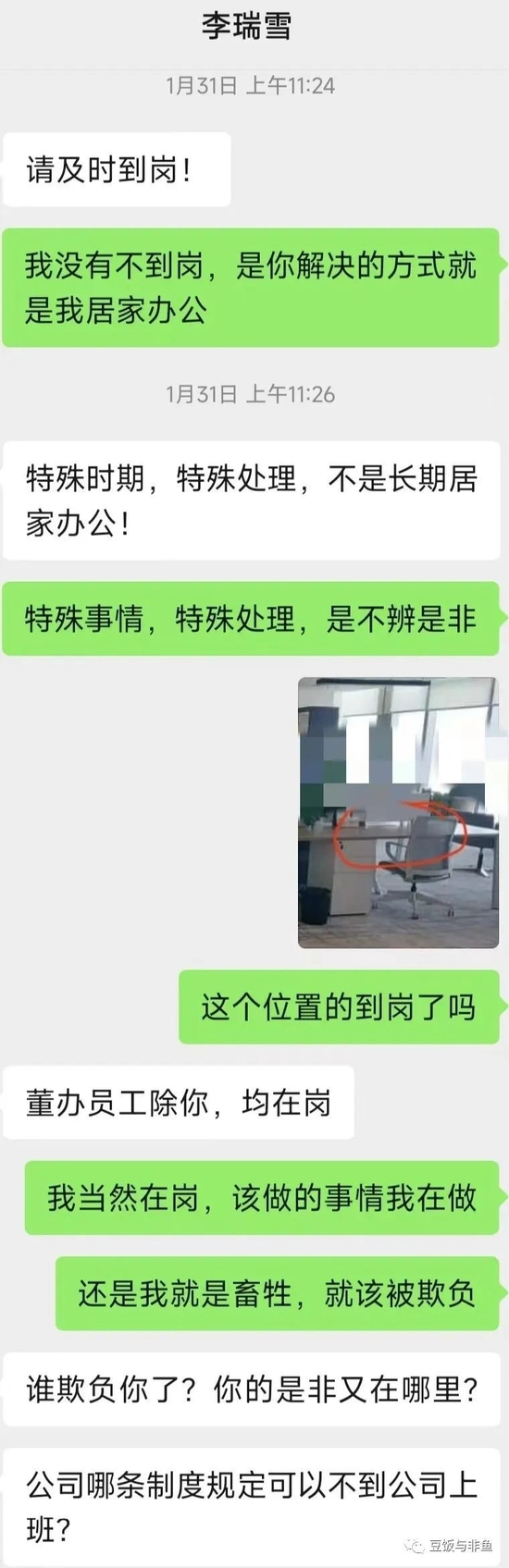 4、2023年2月4日(周六),董秘李瑞雪电话我联系沟通了近1个小时,表示会解决处理这件事情,一是向总经办田章云主任做了反馈,二是沟通王薇和我固定在分开的办公位。2023年2月6日(周一),我结束居家办公到公司办公。