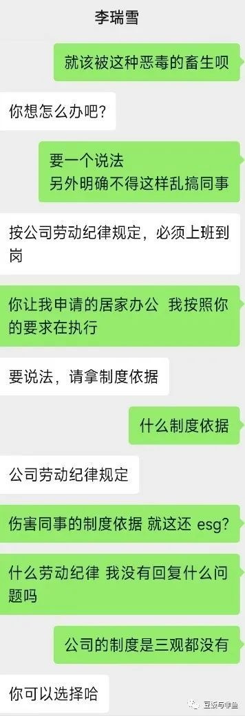 5、董秘李瑞雪是否具备岗位所必需的个人品德?在人事部长在场情况下的发言,董秘李瑞雪对下属员工的无端性骚扰,是一个正常的管理层人员吗?是可以代表公司的形象和价值观的吗?如果他把这样的语言、笑声、表情用到董办的女职工、公司的所有女职工身上,或者换过来,说董事长、总经理、公司的男职工坐女厕所门口,还不入流的笑,还重复,可以吗?事情处理过程中,反反复复反转态度,讲不讲信用?