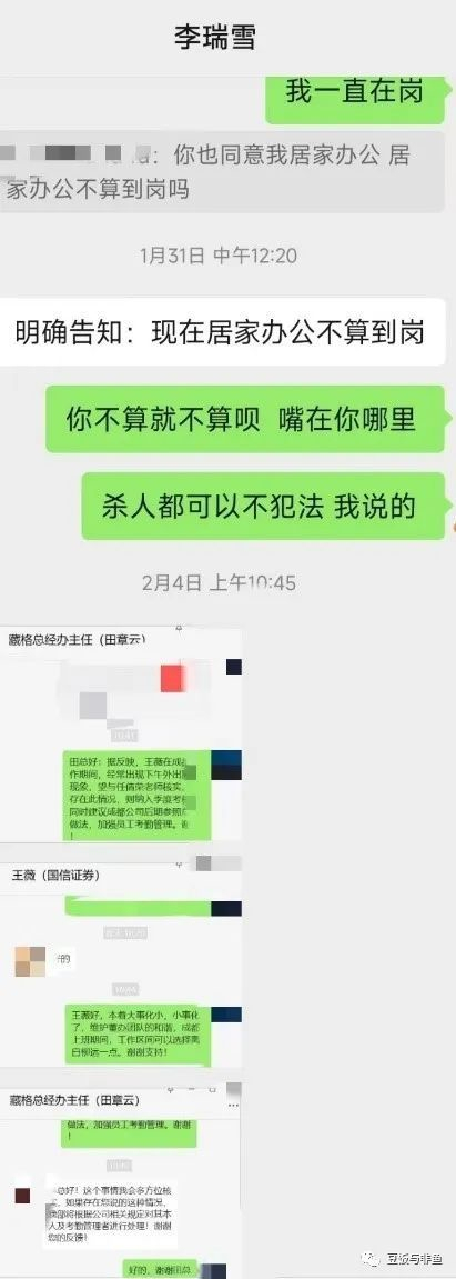 董秘在没有具体问王薇经常下午不在岗的情况下,直接肯定地说王薇的外出都给他做了报备,但也在不能否定王薇阳性与否的情况下,同意我居家办公。