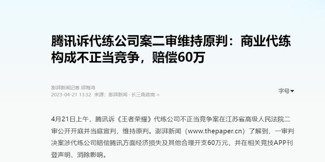 4月21日上午,腾讯诉《王者荣耀》代练公司不正当竞争案在江苏省高级人民法院二审公开开庭并当庭宣判,维持原判。一审判决案涉代练公司赔偿腾讯方面经济损失及其他合理开支60万元,并在相关竞技APP刊登声明、消除影响。