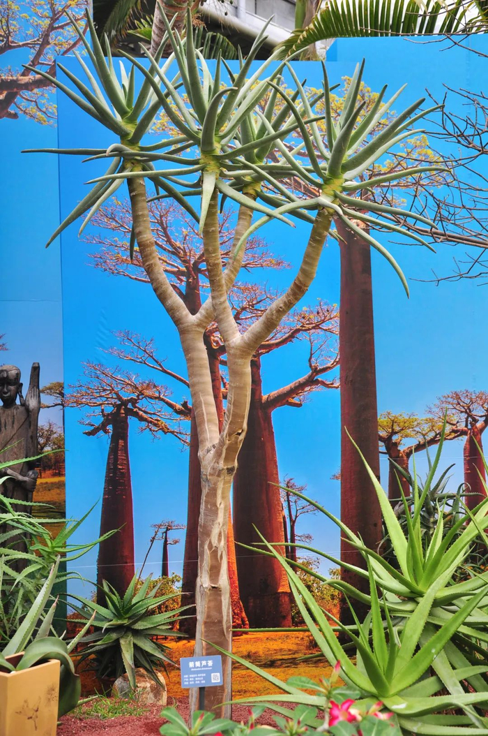 它是芦荟科树芦荟属植物。被CITES附录Ⅱ收录,是世界珍稀植物,它的树干挺拔,为高大的肉质乔木,灰白色的表皮云板状翘起,叶片短粗肥厚,呈灰绿色。枝端开放黄色的花朵,花序穗状。幼年的植株不分枝,成熟的植株需要在10年以上,树冠两两分支。