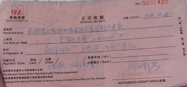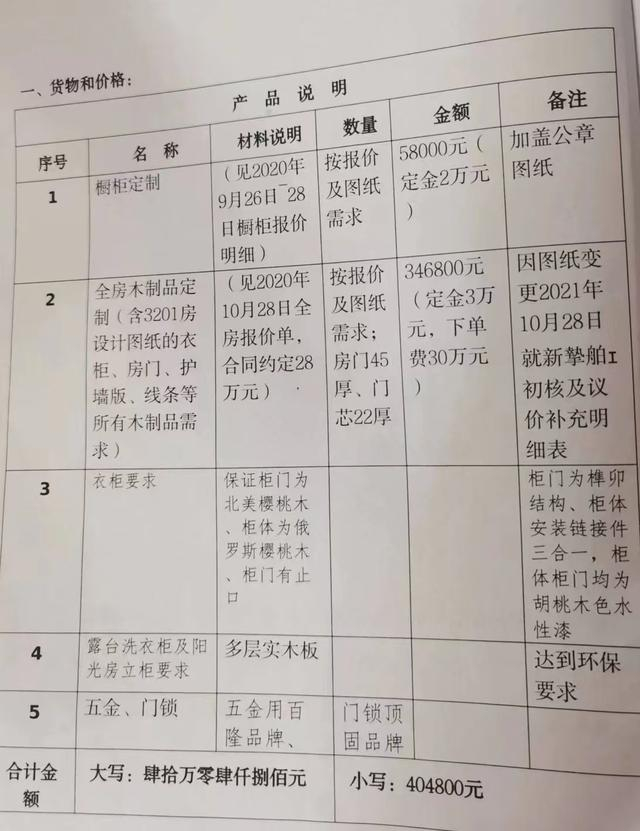 上述合同显示,包括厨柜定制和全房木制品定制在内,货款总计404800元。曹红已交35万元(含定金),等安装验收后再支付余款54800元。合同对衣柜的要求仍为“保证柜门北美樱桃木、柜体俄罗斯樱桃木”。