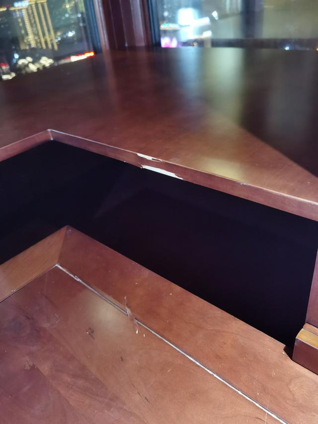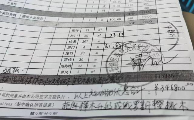 为何在家具材料中采用并未写入客户合同的橡胶木?刘美芳解释称,因为柜体和柜门材质不一样,为保证颜色和纹理一致,所以进行“贴皮”。“原木拼接就一定要留工艺缝,否则容易变形,所以我们用(橡胶木)指接板来贴木皮。”她说:“见光面如果用樱桃木,那价格不一样。”