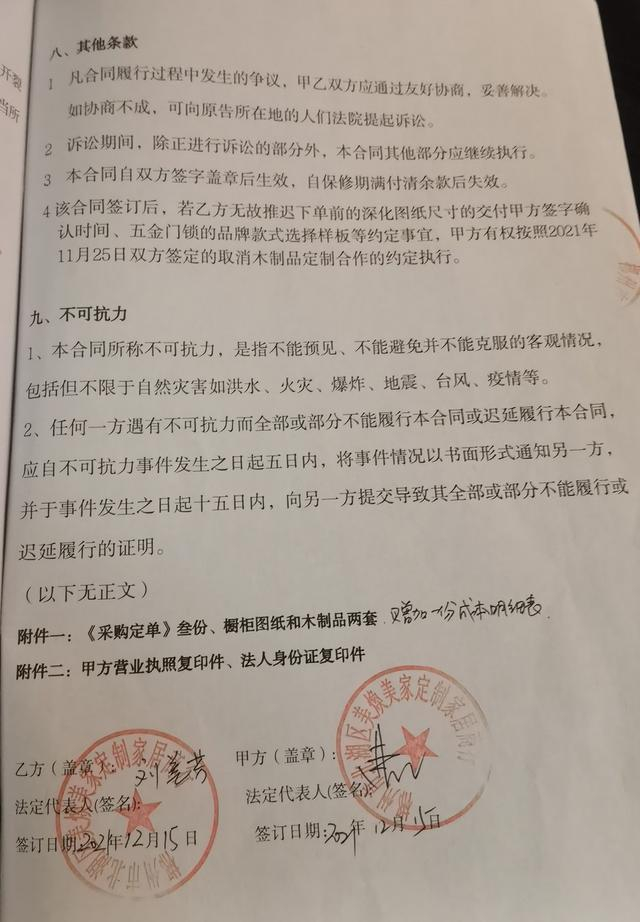 “当时她要我在厂家的清单上签字,我不愿签。我跟你已经签了合同,你跟厂家下单干嘛要我签字呢。”曹红回忆,解除合同后,因刘美芳迟迟未退还30万货款,双方最终继续履约,在2021年12月重新签订《木制品定购合同》。双方都在合同上签字,还加盖了刘美芳的门店——郴州市北湖区美焕美家定制家居商行的公章。“她盖章盖错到甲方了,就又重盖了一个。”曹红说。