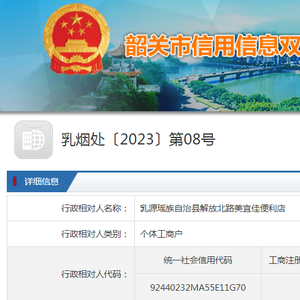 【广东韶关】关于乳源瑶族自治县解放北路美宜佳便利店的行政处罚决定书 乳烟处〔2023〕第08号