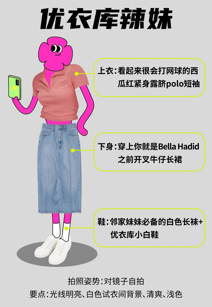 经历这么一场风波后,不知优衣库是否如梦初醒般看到了商机,干脆做起了辣妹装女团风。官方微博晒出的穿搭图直接称其为“辣妹T”。