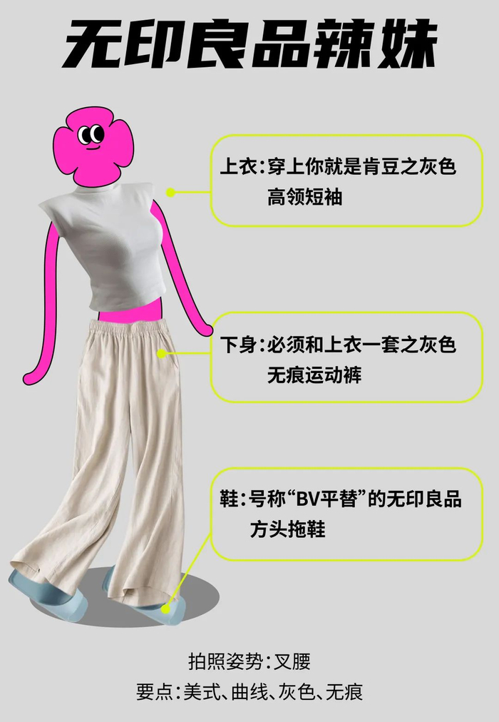 新女团接二连三出道,女团成员偏爱的辣妹风也从小众穿搭成为了大众审美。不止优衣库,“中产三件套”萨洛蒙、始祖鸟、Lululemon都有了属于自己的“女团神仙单品”,一直“无欲无求”的无印良品也被划为辣妹神器,耐克阿迪不在话下,鱼骨上衣、绑带设计元素齐全,一直以来在工装届驰骋的Dickies也因为Blackpink的Jennie同款分了一杯“辣妹羹”。