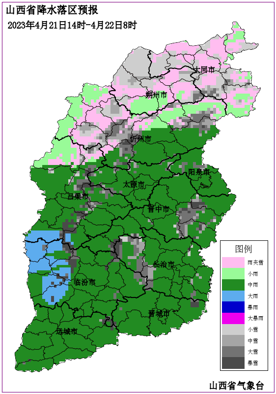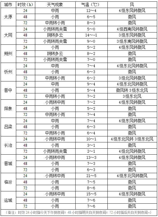 全省阴天间多云,忻州及其以南大部分地区有小雨或雨夹雪,山区有中到大雪,南部部分地区有中雨。