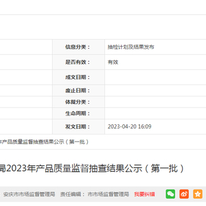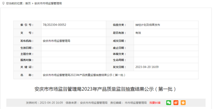安徽省安庆市市场监管局公示2023年产品质量监督抽查结果(第一批)