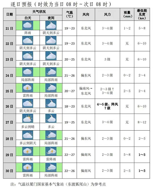 ➪降水:21日、24—25日、28—30日有降水,其中25日、29—30日降水时局地伴有雷雨大风、短时强降水等强对流天气,能见度下降;其余时段以阴天到多云天气为主。
