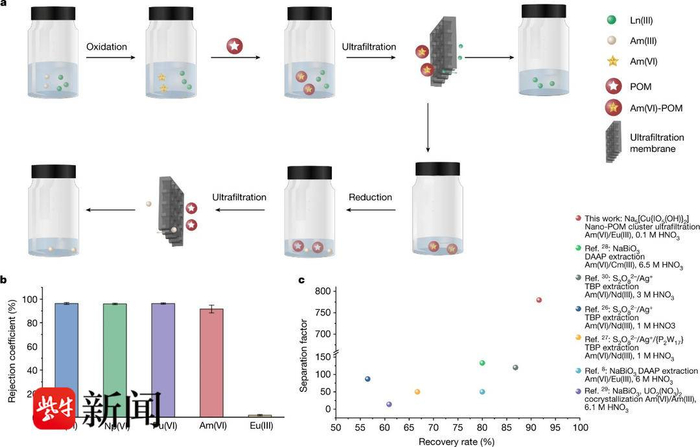 最后,利用镅多酸纳米复合物与水合镧系离子之间的尺寸差异并结合商用超滤技术,发展了一种全新的镧锕超滤分离方法,获得了高达780的二元镧锕单步分离因子和91%的单步镅回收率。这也是至今国际上报道的六价镅和三价镧系之间的最好分离效果。此方法具有高效、安全、环境友好、快速且低能耗等系列优势,具有良好的应用前景。