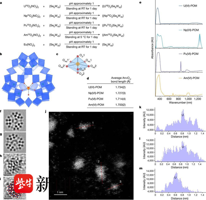 为了可视化六价锕系元素与多酸簇合物间的相互作用,研究团队制备了一系列六价锕系多酸纳米复合物的单晶化合物,同时获得了国际上首例稳定的六价镅化合物的单晶结构。X射线单晶衍射分析表明六价镅被完全封装在预先设计的缺位结合位点中,进一步证实了缺位多酸簇合物对六价镅的精准识别作用。