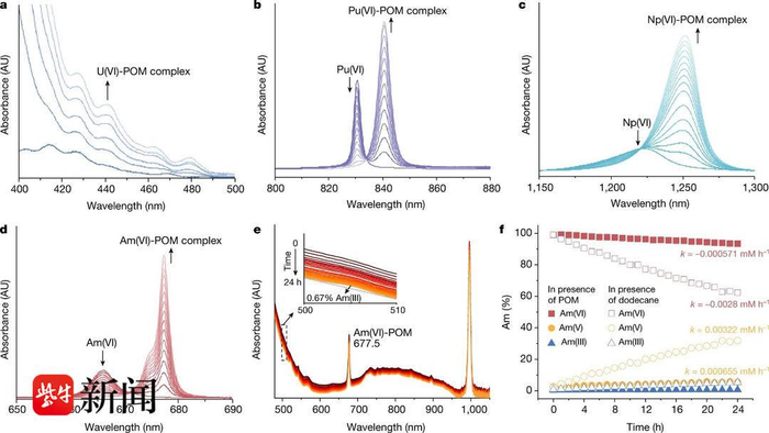 据悉,该放射化学联合研究团队首先利用光谱技术研究了六价锕系元素(铀、镎、钚、镅)和三价镧系元素铕与该多酸簇合物的作用机理(图2)。结果表明在酸性溶液中,由于精准匹配缺位结合位点的存在,该多酸簇合物可与六价镅发生极强的络合作用,而与三价铕之间几乎不发生相互作用。此外,该多酸簇合物对于六价镅来说是一种具有“化学惰性”和“位阻效应”的保护性基团,能够将酸性溶液中的六价镅稳定超过24小时,从而为后续的分离过程提供了前提。